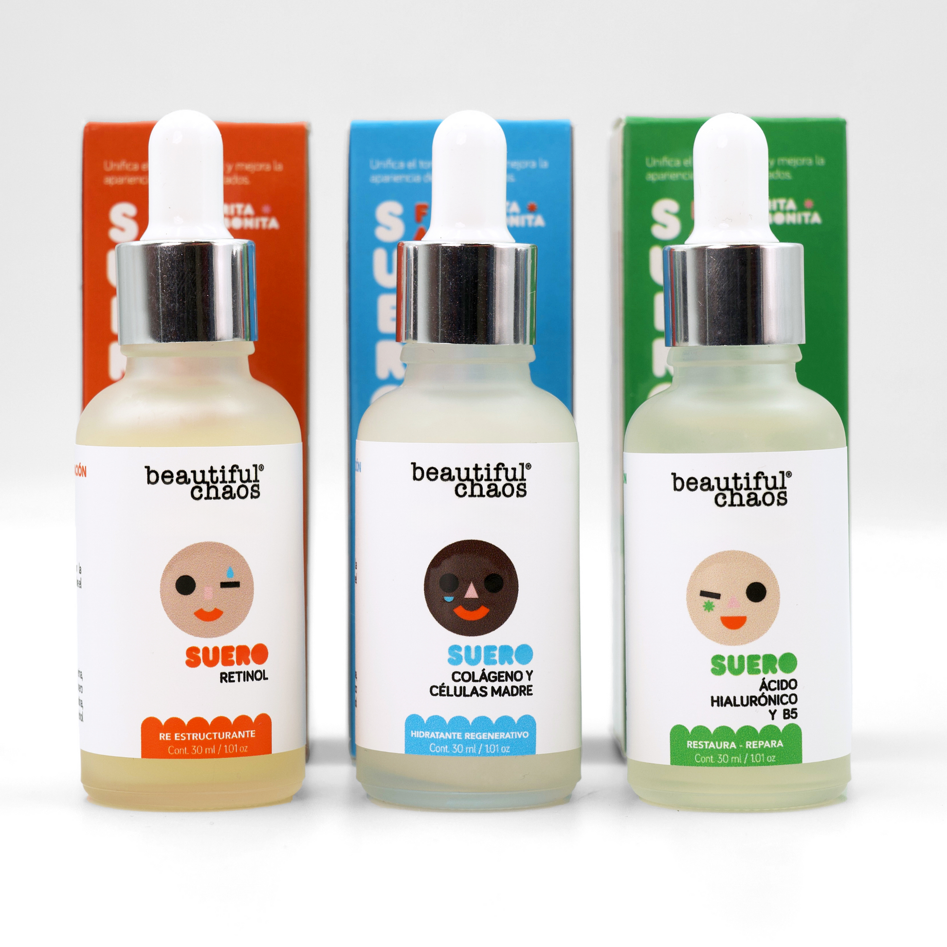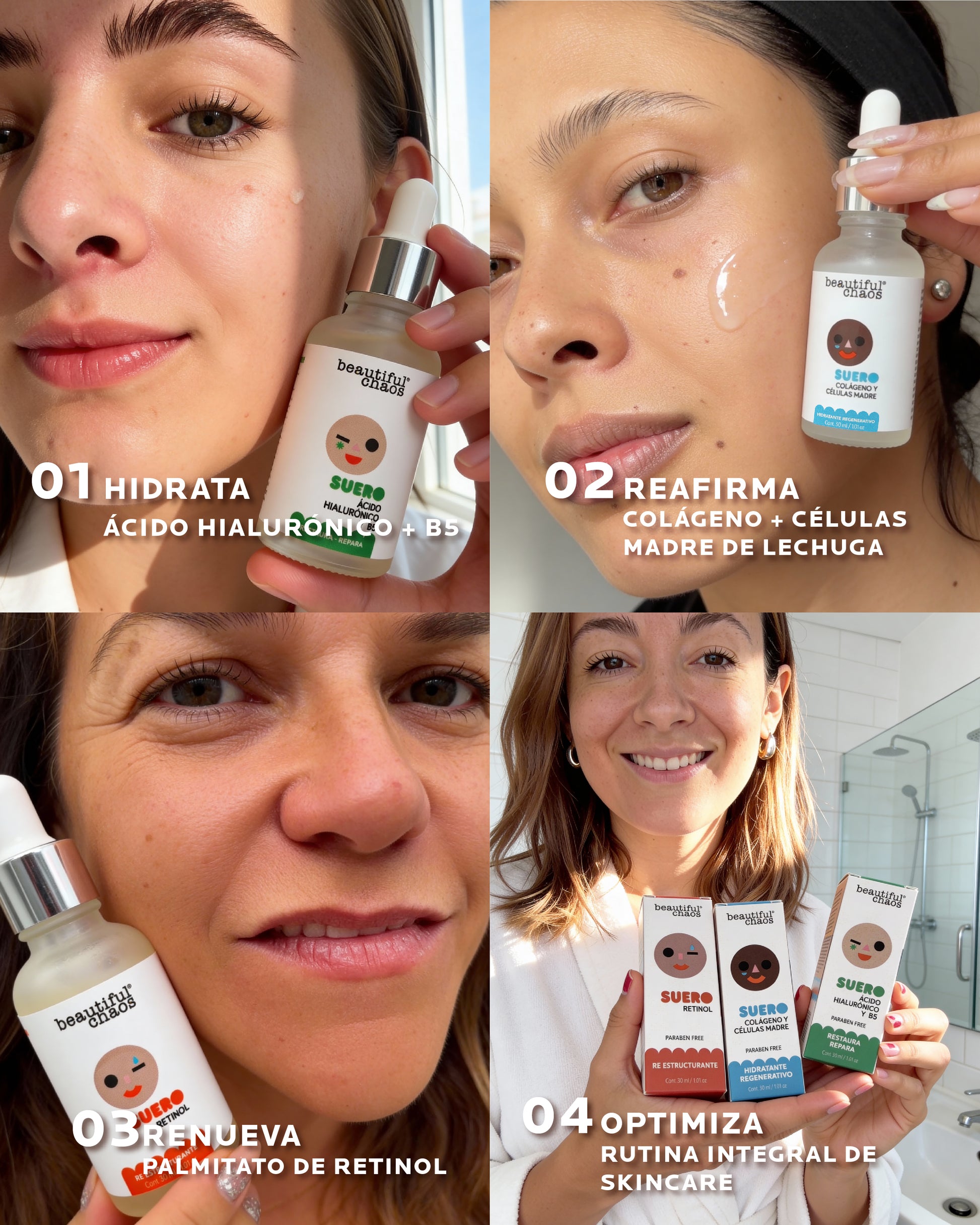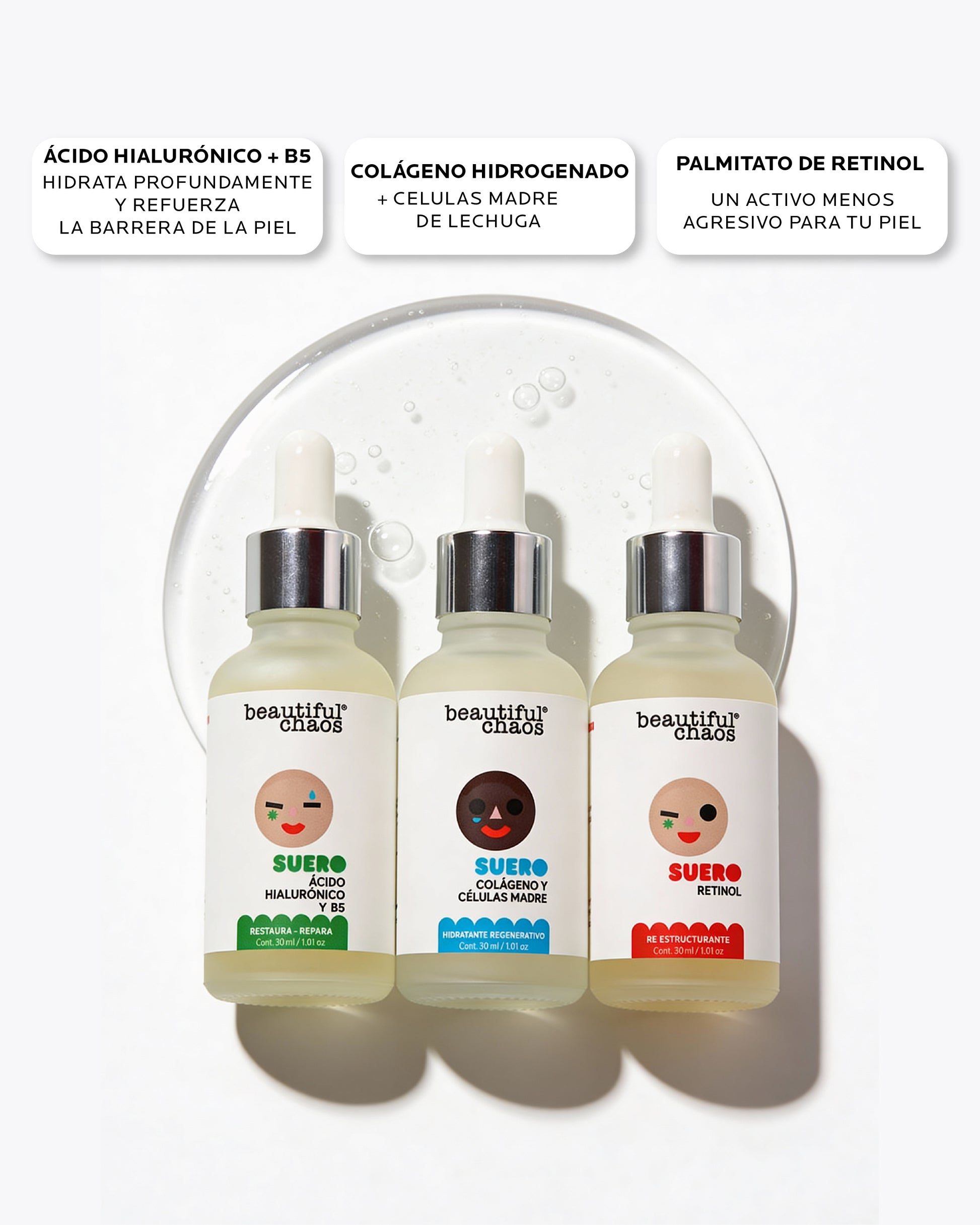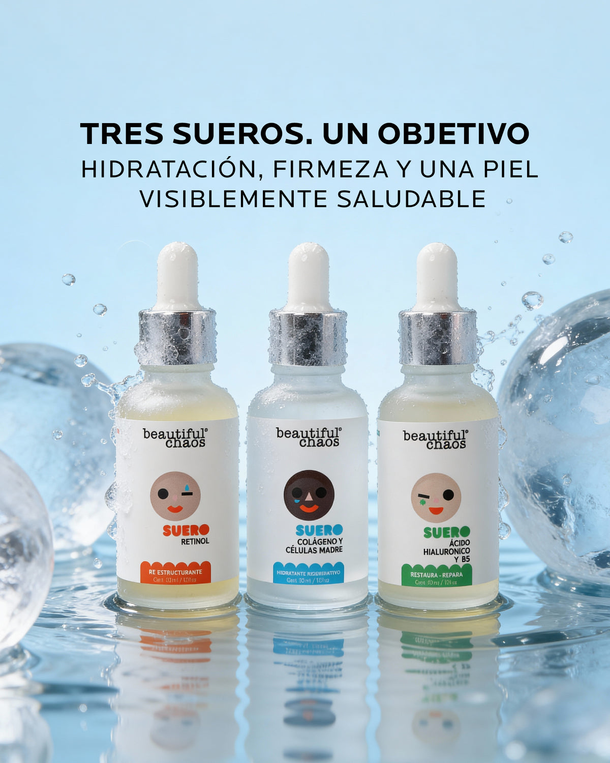 Tres sueros. Un solo objetivo: piel firme, hidratada y renovada.
